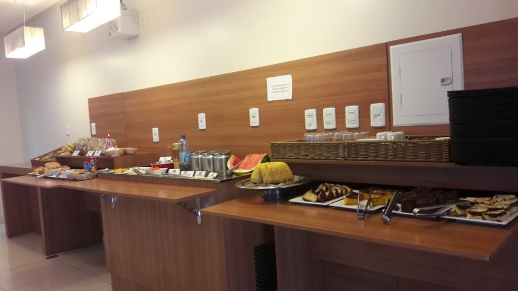 Ambiente moderno e buffet equilibrado, com variedade suficiente para agradar quem busca um café funcional e bem servido.