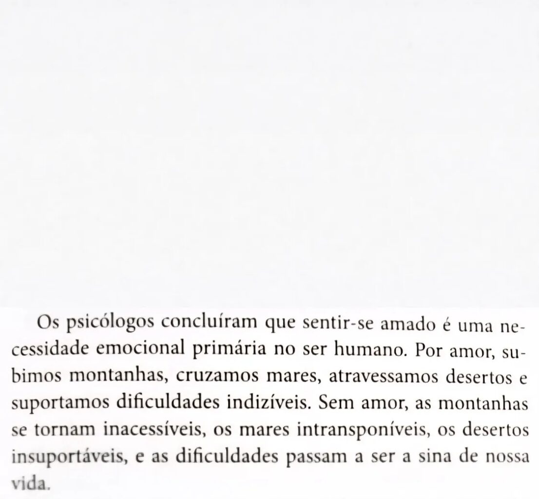 “Os psicólogos concluíram que sentir-se amado é uma necessidade emocional primária no ser humano. Por amor, subimos montanhas, cruzamos mares, atravessamos desertos e suportamos dificuldades indizíveis. Sem amor, as montanhas se tornam inacessíveis, os mares intransponíveis, os desertos insuportáveis, e as dificuldades passam a ser a sina de nossa vida.”